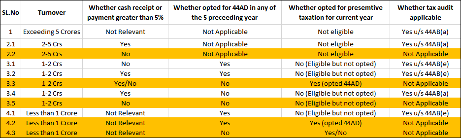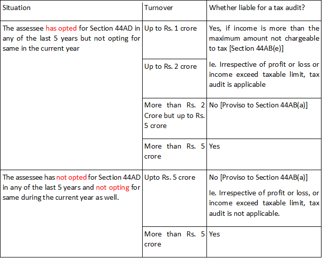 Note 2: Tax audit for an assessee with turnover less than one crore is applicable only to whom sec 44AD(4) applies (as discussed above under clause 44AB(e))