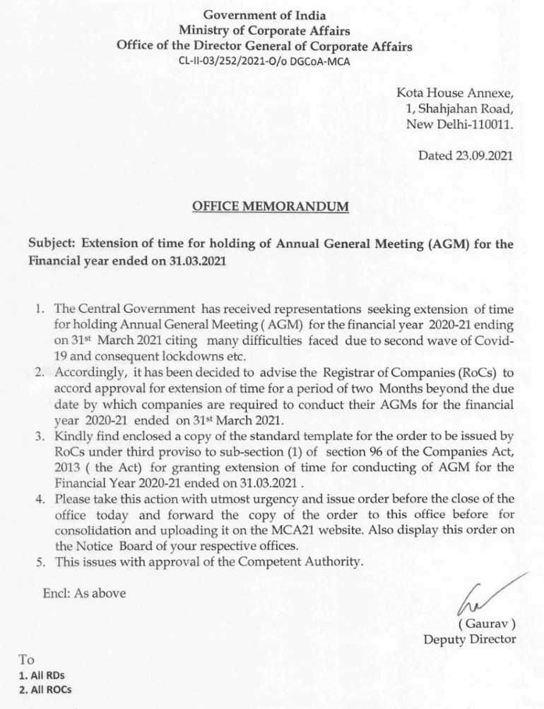 Considering the difficulties being faced due to second wave of Covid-19 and consequent lockdown etc, Ministry of Corporate Affairs(MCA) has decided to accord approval for extension of time for a period of two months beyond the due date by which the companies are required to conduct their AGM for the financial year 2020-21 ended 31st March 2021.