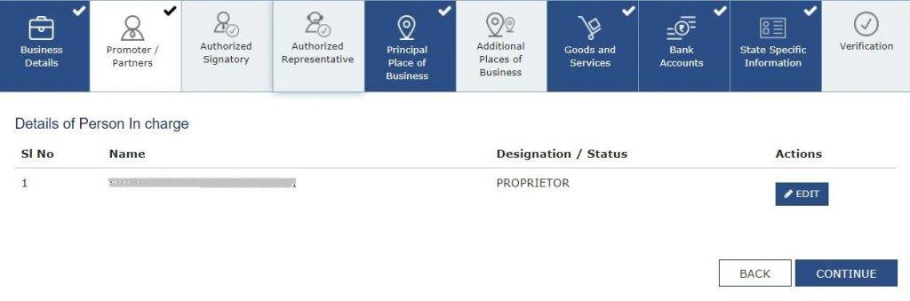 Step 2: Click on the tab ‘Promoter/Partners’. Click on the ‘Edit’ button under ‘Actions’, next to the authorised signatory, whose details you wish to change.