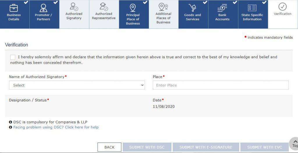 Step 5: Go to the ‘Verification’ tab. After entering the required information, tick the declaration checkbox, and submit the form with DSC/E-signature/EVC.